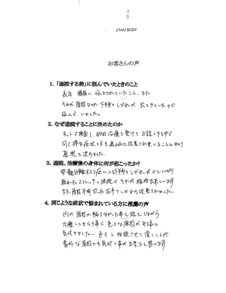 長年、腰痛に悩まされていたことを、またそれが原因なのか下半身のしびれが出てきていたので悩んでいました。